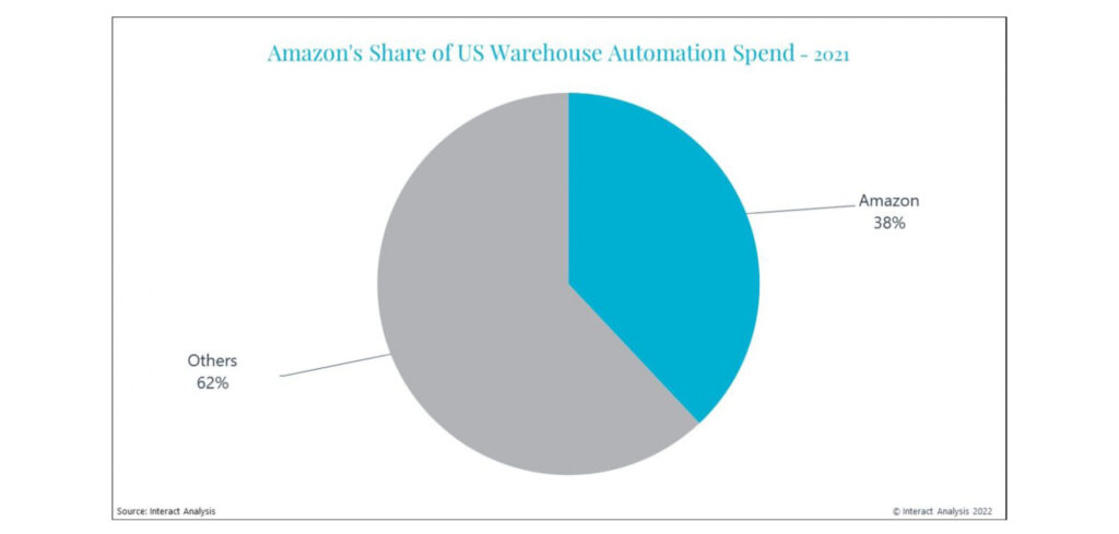 Accounting for more than 35% of the demand for warehouse automation in the USA in 2021, Amazon’s slowdown will certainly have a big impact on the overall market. Our latest analysis suggests that Amazon’s investments in warehouse automation will decrease by 26% in 2022 relative to its spend in 2021.
