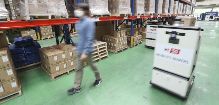 The autonomous carts move smartphones and other devices at KT’s Seobu Distribution Center, and have reduced employee travel range for loading and transporting inventory by almost 50%.
