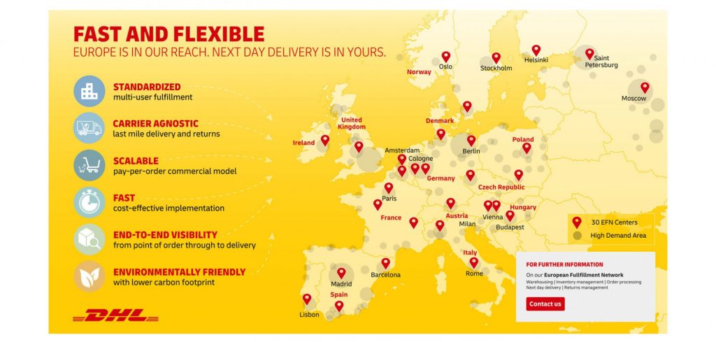 By pooling multiple customers in centrally located, multi-user facilities, retailers and organizations adopting a direct-to-consumer sales strategy can benefit from the European network. “We have found DHL’s European Fulfillment Network to be an ideal fit for us as we started e-commerce business to end customers in Germany and aim to rapidly scale into several European markets using this product,” remarked Manav Bhandari , CEO of retailer Jamoona.