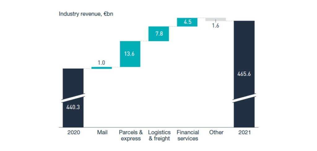 On aggregate, total postal industry revenue reached €465.6bn (US$491bn) in 2021, up €25.3bn (US$26.7bn) on 2020 results. Posts saw revenue growth of 3.9% on average, twice as high as the 2020 growth rate of 1.9%. The continued uplift in e-commerce, driven by the Covid-19 pandemic, was the engine of industry growth as increasing volumes saw parcel revenue rise €13.6bn (US$14.3bn). Meanwhile, industry mail revenue recovered, increasing €1bn (US$1bn), with rate increases and business mail demand supporting improved performance for some large posts. However, with volumes continuing to drop for most posts, mail division revenue continued to fall on average.